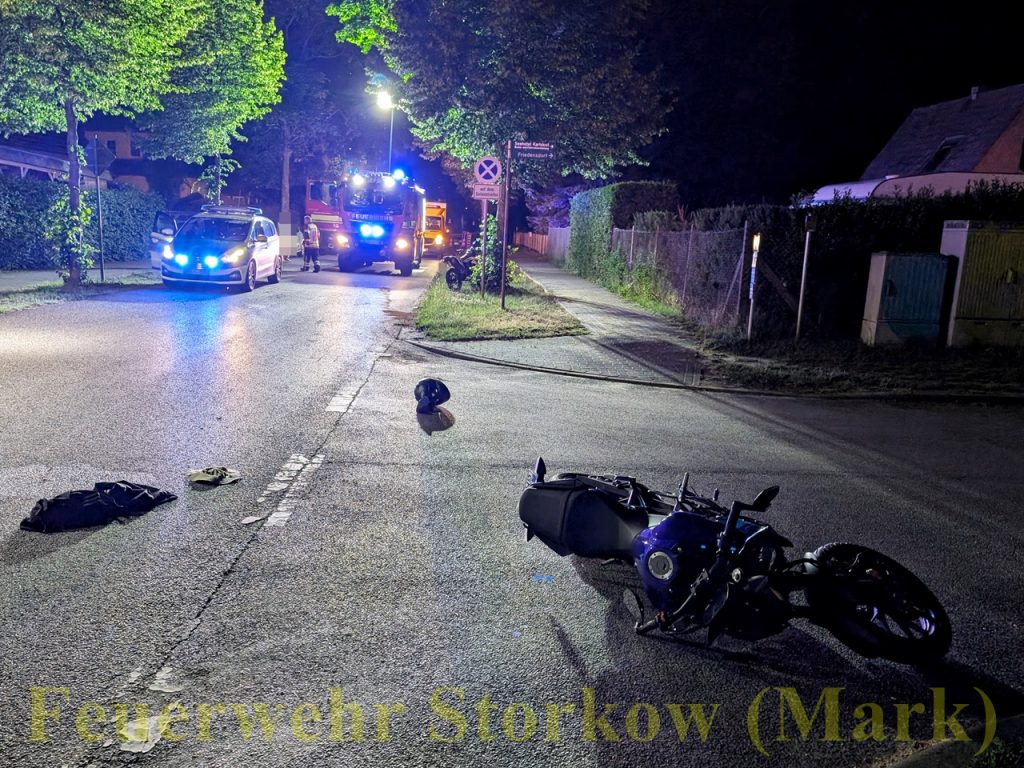 In der Nacht auf Freitag kam es im Ortsteil Karlslust zu einem Verkehrsunfall mit zwei Motorrädern, bei dem beide Fahrer stürzten und sich verletzten. Der Rettungsdienst versorgte sie und brachte sie in ein Krankenhaus. Wir streuten ausgelaufene Betriebsstoffe ab und räumten die Unfallstelle.