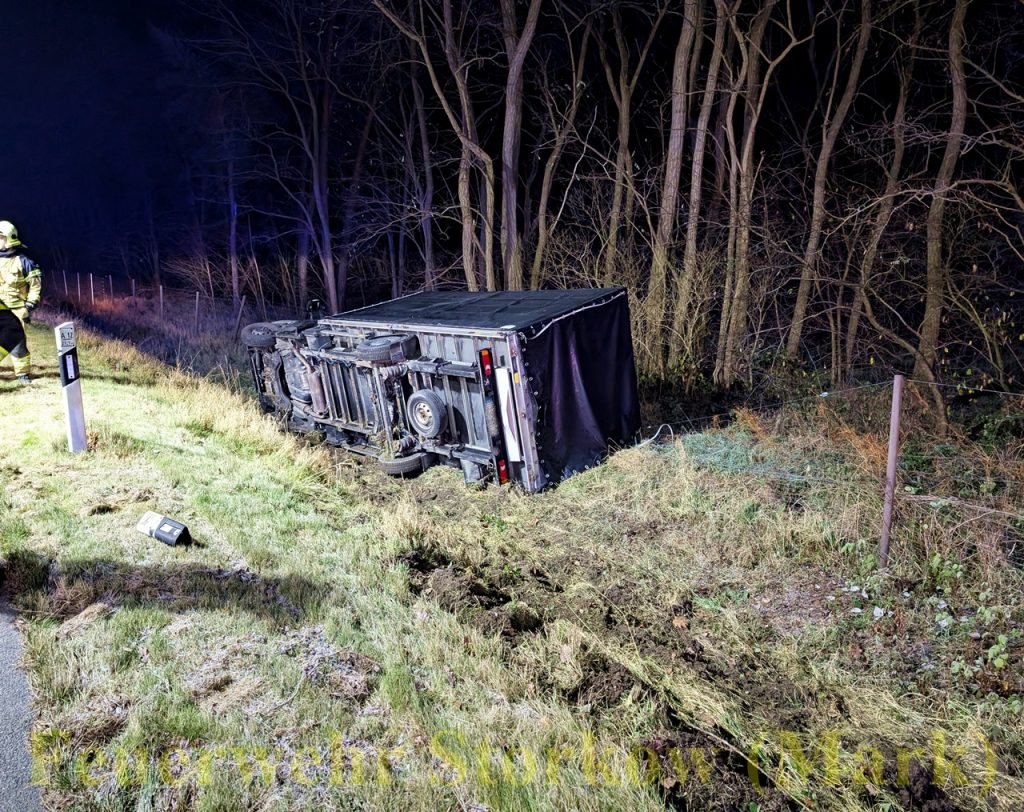Ein Transporter kam von der Fahrbahn ab und blieb im Graben auf der Seite liegen. Eine Person wurde dabei verletzt und vom Rettungsdienst versorgt. Für die Feuerwehr bestand kein weiterer Handlungsbedarf.