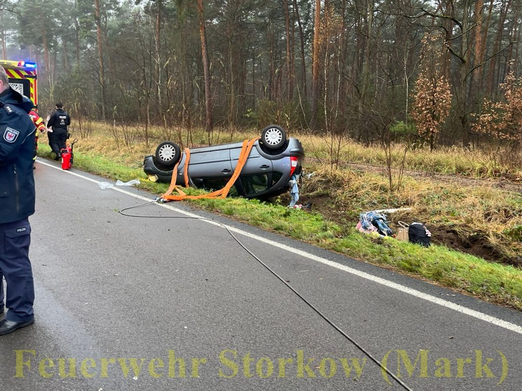 Ein Pkw kam von der Fahrbahn ab, überschlug sich und kam auf dem Dach zum Liegen. Eine Person wurde verletzt und durch den Rettungsdienst versorgt. Mithilfe der Seilwinde des HLF wurde der Pkw wieder auf die Räder gestellt, um die Fahrzeugbatterie abklemmen zu können.